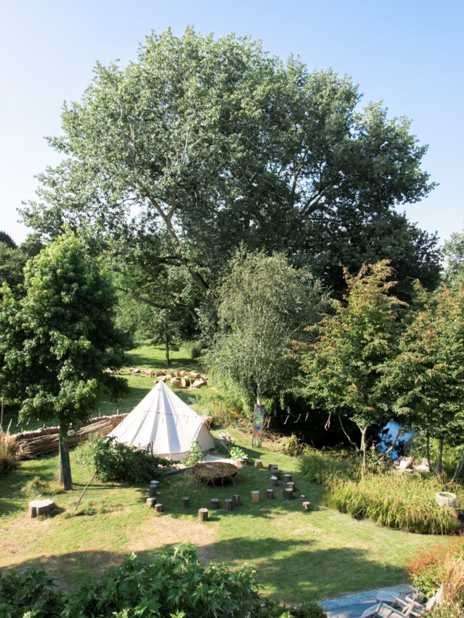 Achterin de tuin, het voormalige weiland van boer Tinus, staat een immens grote boom, zijn wortels dragen deze plek en brengen hier de magie tot leven. De naam is een ode aan de boom en boer Tinus, de grondlegger van deze plek.
